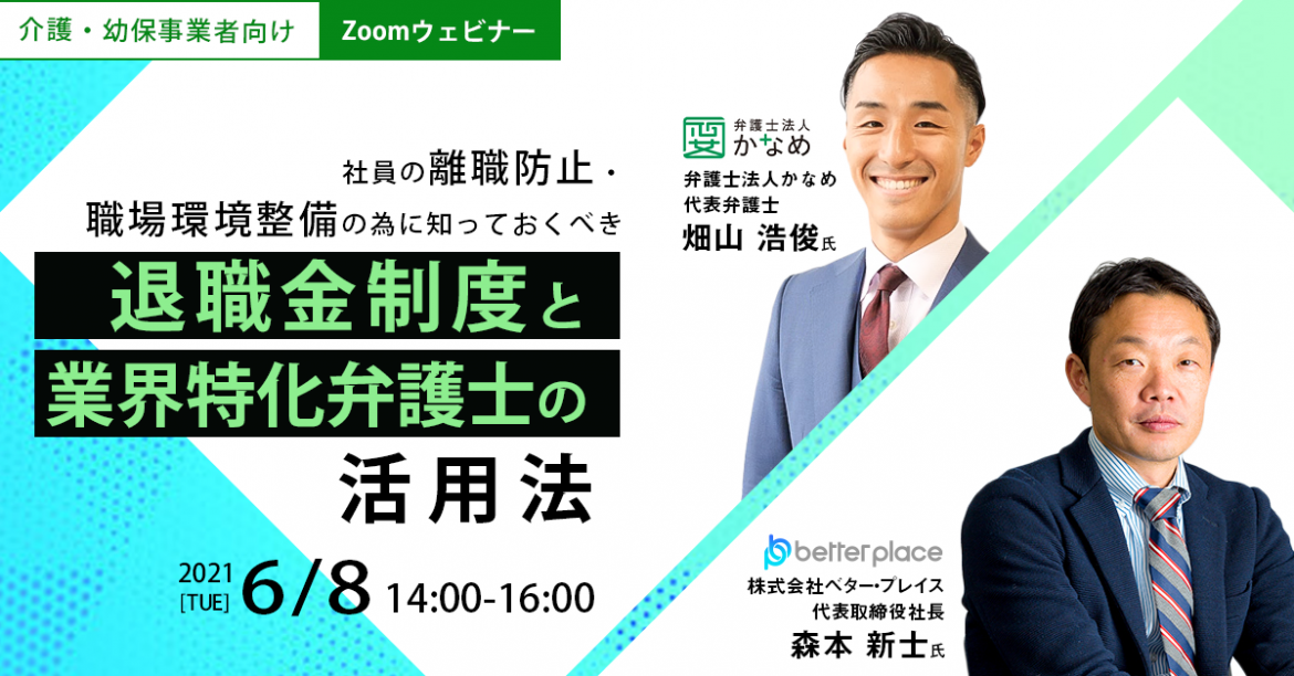 【介護・幼保事業者向けウェビナー】社員の離職防止・職場環境整備の為に知っておくべき退職金制度と業界特化弁護士の活用法