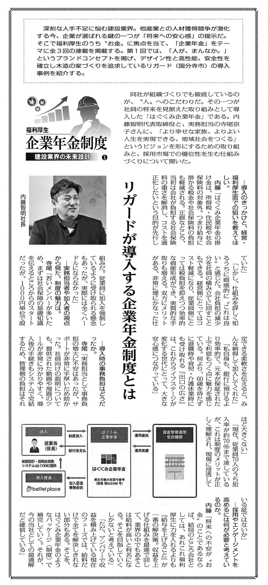 第1回では、株式会社リガード様の事例として、同社が「はぐくみ企業年金」を導入した背景や、福利厚生としての企業年金制度の意義についてインタビュー形式で紹介されています。