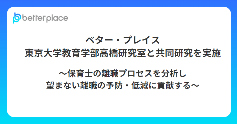 ベター・プレイス、東京大学教育学部高橋研究室と共同研究を実施。保育士の離職プロセスを分析し、望まない離職の予防・低減に貢献する
