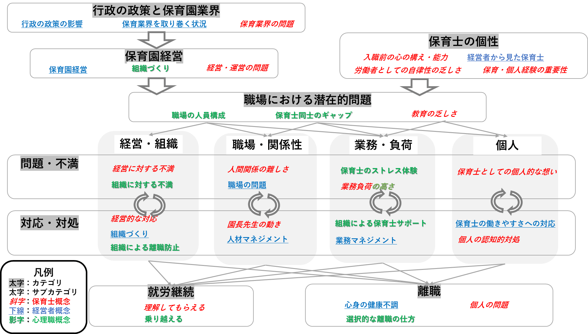 【行政の政策と保育業界】という前提の下で【保育園経営】が行われる。一方で、保育士の個性もあり、その両方から【職場における潜在的問題】につながる。さらに、そこから【問題・不満】と【対応・対処】が生じるが、いずれも経営・組織、職場、関係し、業務・負荷、個人の4つに分類された。各々の領域において【問題・不満】と【対応・対処】の間に葛藤が生じる。その結果、【就労継続】に至る場合と、【離職】に至る場合に分かれた。