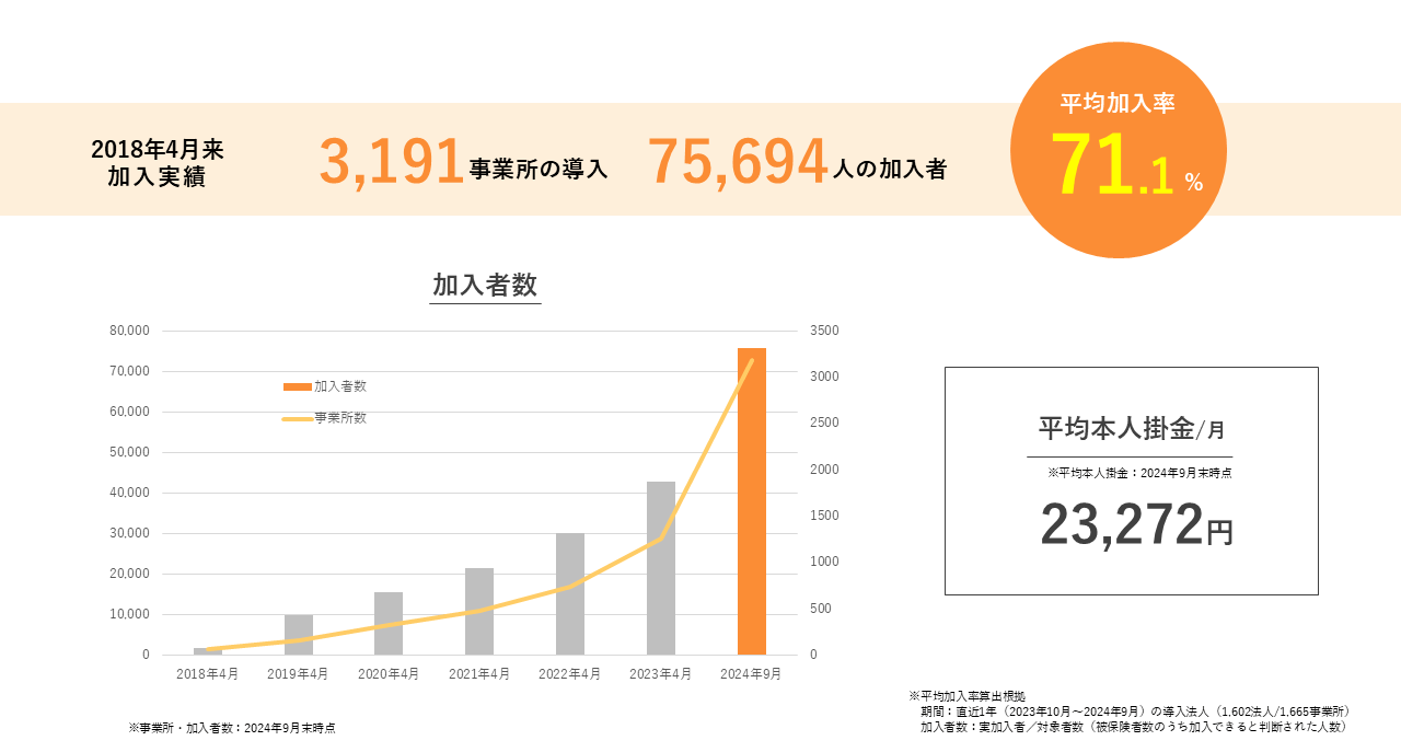「はぐくみ企業年金」は厚生年金被保険者であれば、従業員(非正規雇用含む)でも役員でも加入可能な確定給付企業年金(DB)で、事業主側はコストを抑えながら企業年金・退職金制度を構築することができます。企業年金・退職金制度の充実が従業員満足度向上・離職率低下につながることから、特に人手不足が深刻化している福祉業界において、人材定着をはかるための福利厚生のひとつとしてご好評いただいています。