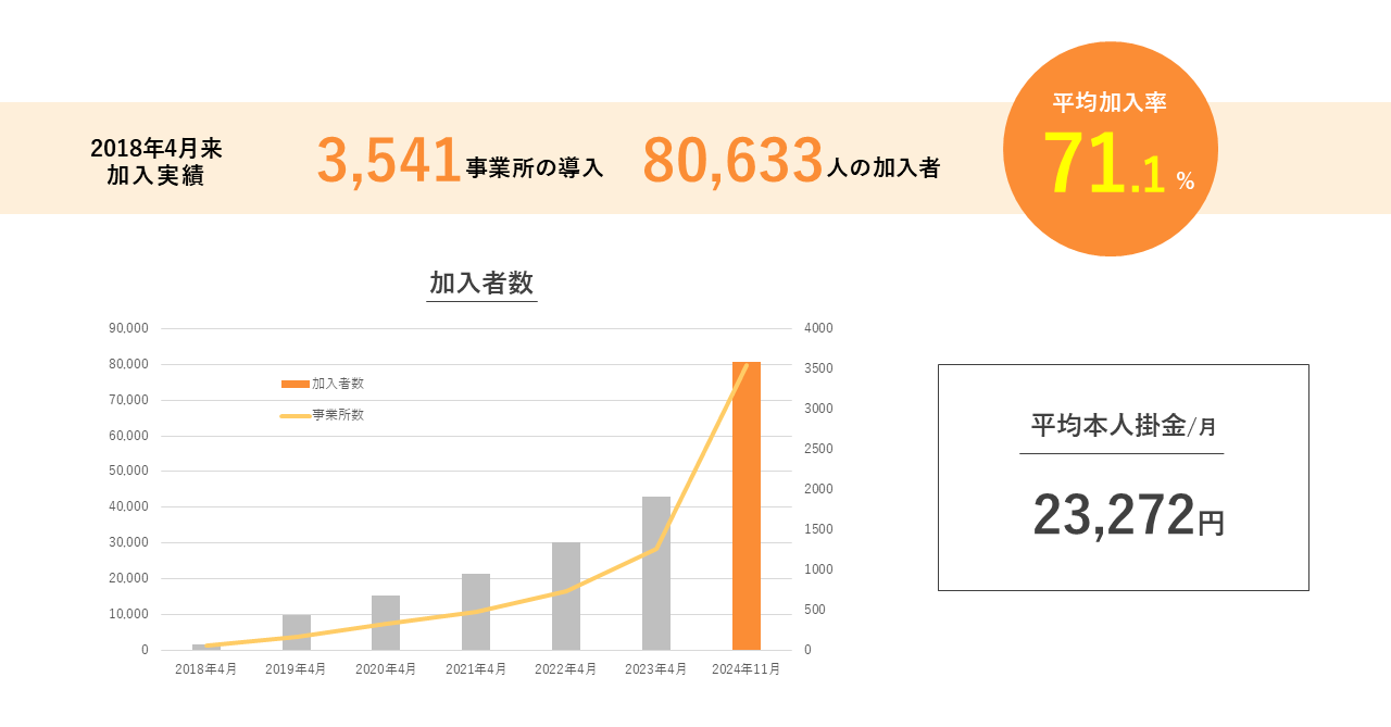 今年で設立から6年を迎え、加入者は8万人、導入法人数は3,000社を突破しました。さらに1年間の新規導入コンサルティング契約社数(2023年10月~2024年9月)が昨年比190%となる2,000社を突破するなど、業種を問わず多くの中小企業経営者、従業員の皆様からご支持をいただいています。