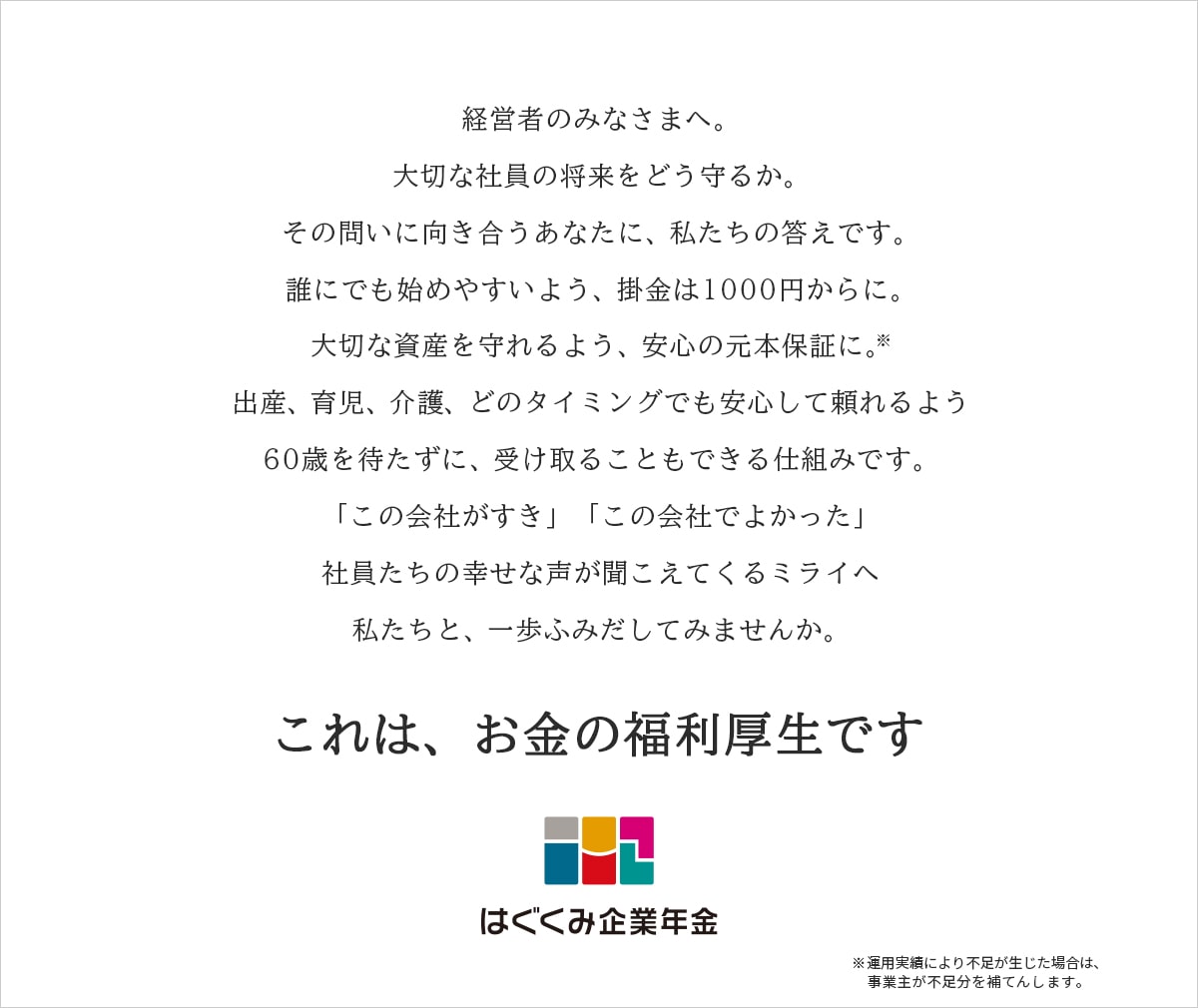 今後も、より多くの方々に「はぐくみ企業年金」を知っていただき、社会を支えてくださるすべての方々に経済的な幸せをお届けできるよう、全力で取り組んでまいります。