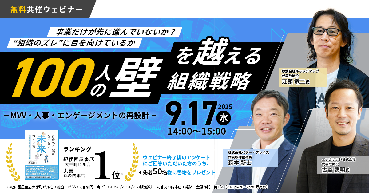 「福祉はぐくみ企業年金基金」(以下、「はぐくみ企業年金」)を中心に、企業年金・退職金制度の導入・設計をサポートする株式会社ベター・プレイス(本社:東京都新宿区、代表取締役社長:森本 新士、https://bpcom.jp/、以下、ベター・プレイス)は、エンカレッジ株式会社、株式会社キャッチアップと共催で、2025年9月17日(水)に従業員30〜100名規模の経営者を対象としたオンラインセミナー「“100人の壁”を越える組織戦略 ~MVV・人事・エンゲージメントの再設計~」を開催いたします。