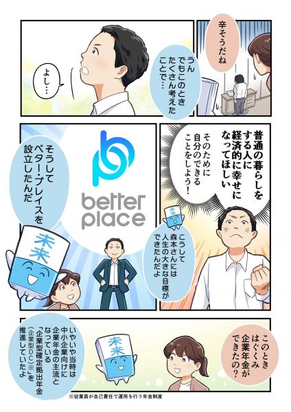 ベター・プレイス代表 森本の著書「お金の心配がなくなる未来のつくり方」を元にしたマンガ、『はぐくみ企業年金ものがたり』を公開
