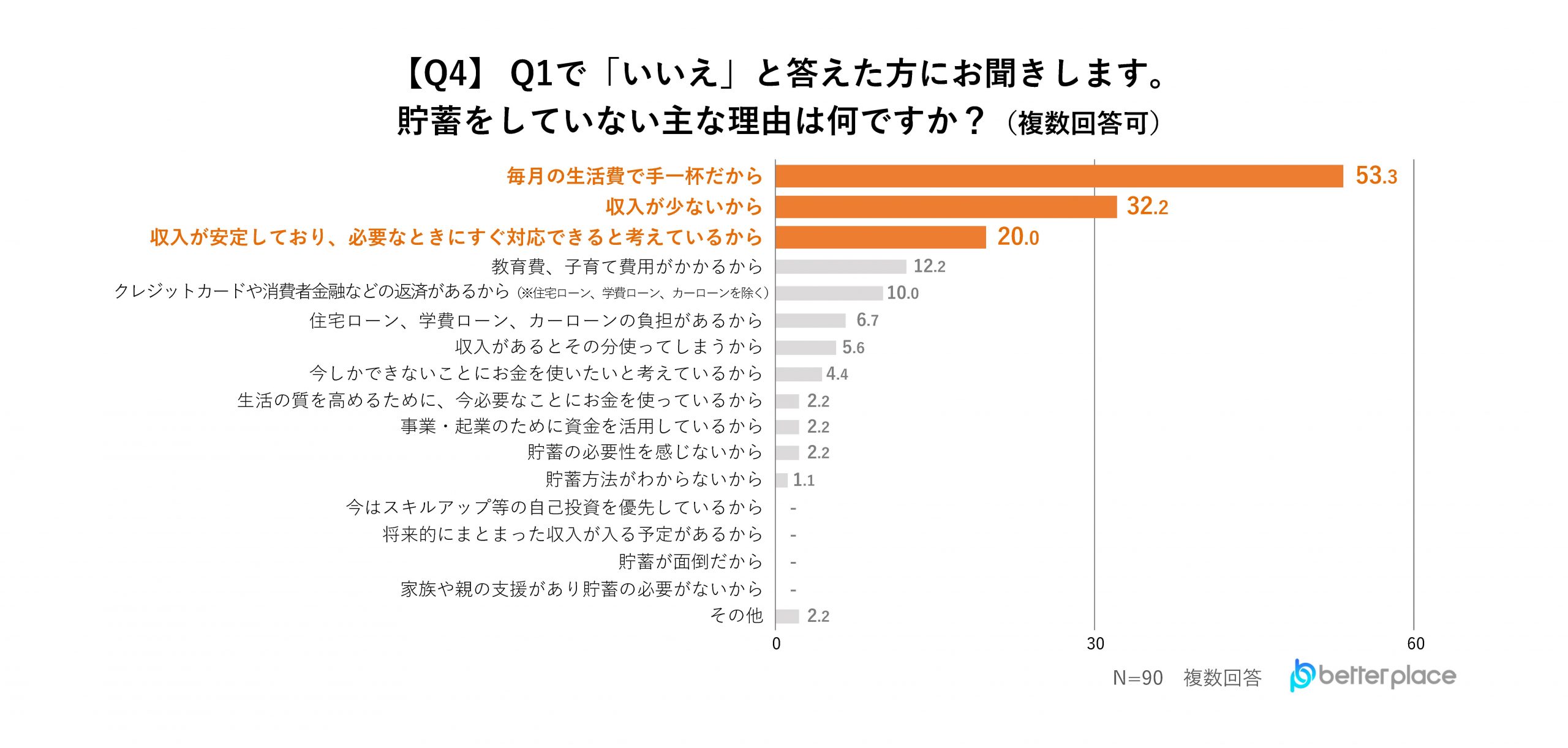 貯蓄がないと答えた人に、貯蓄をしていない理由を聞いたところ、「毎月の生活費で手一杯だから」と回答した人が53.3%で1位、次いで「収入が少ないから」が32.2%、「収入が安定しており、必要なときにすぐ対応できると考えているから」が20.0%という結果となりました。