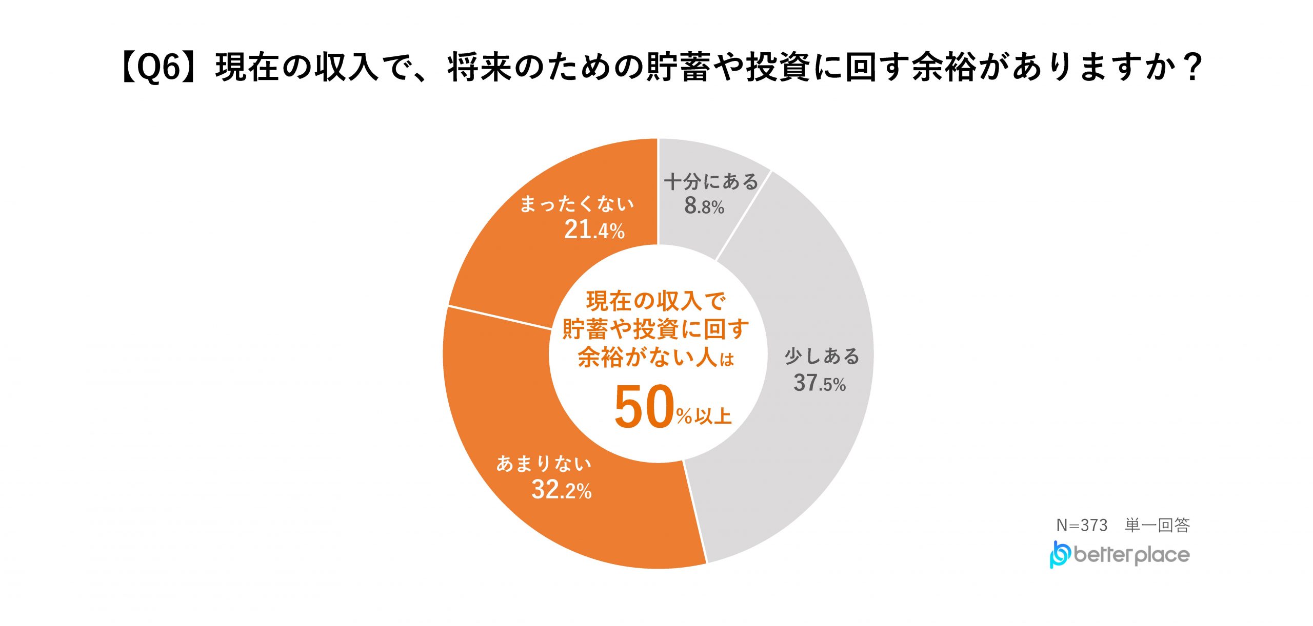 現在の収入で、将来のための貯蓄や投資に回す余裕があるか聞いたところ、「あまりない」と回答した人が32.2%、「まったくない」と回答した人が21.4%と、半数以上の人に将来のための貯蓄や投資をする余裕がないことがわかりました。