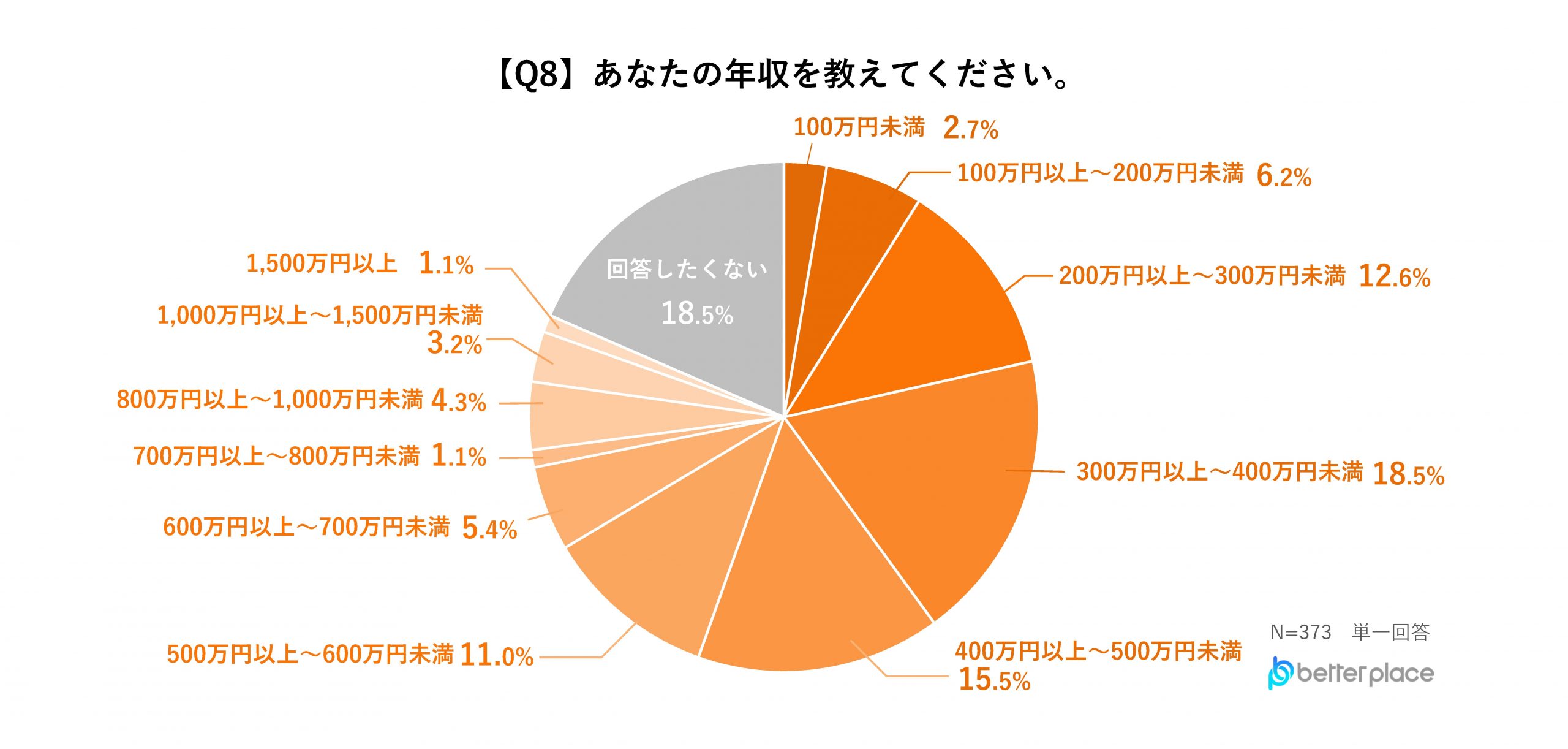 現在の年収を聞いたところ、「300万円~400万円」と回答した人が18.5%で1位、次いで「400万円~500万円」が15.5%、「200万円~300万円」が12.6%という結果となりました。