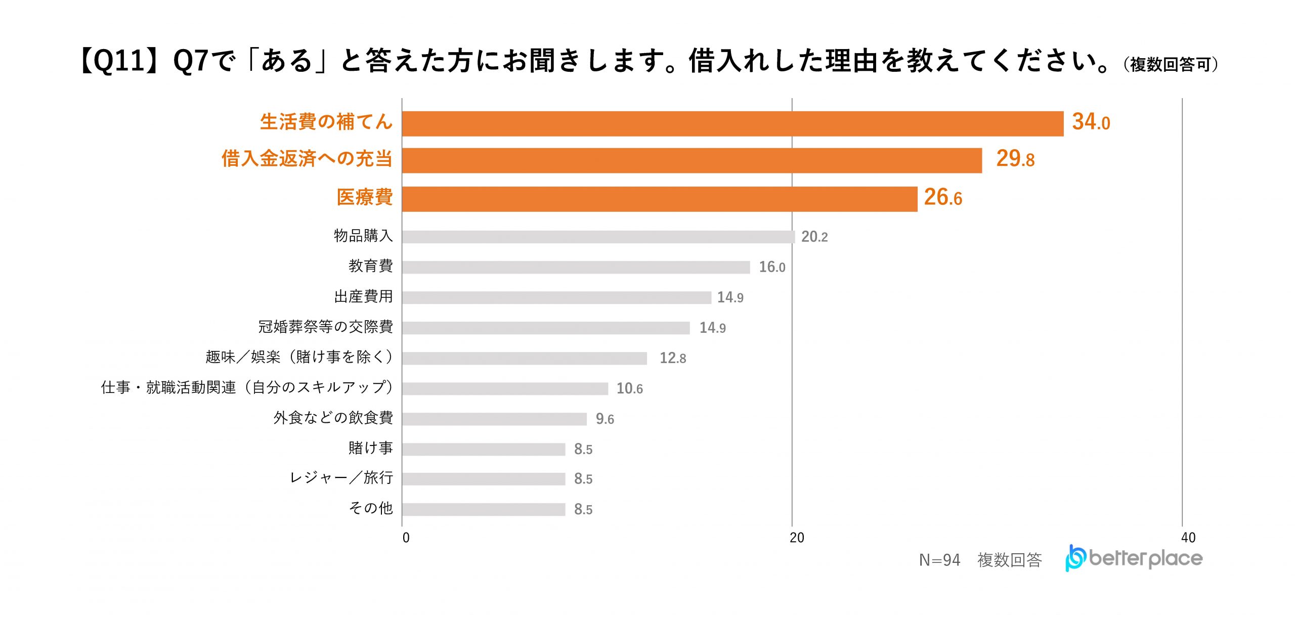 借入れがあると答えた人にその理由を聞いたところ、「生活費の補てん」と回答した人が34.0%と最も多く、次いで「借入金返済への充当」が29.8%、「医療費」が26.6%という結果となりました。