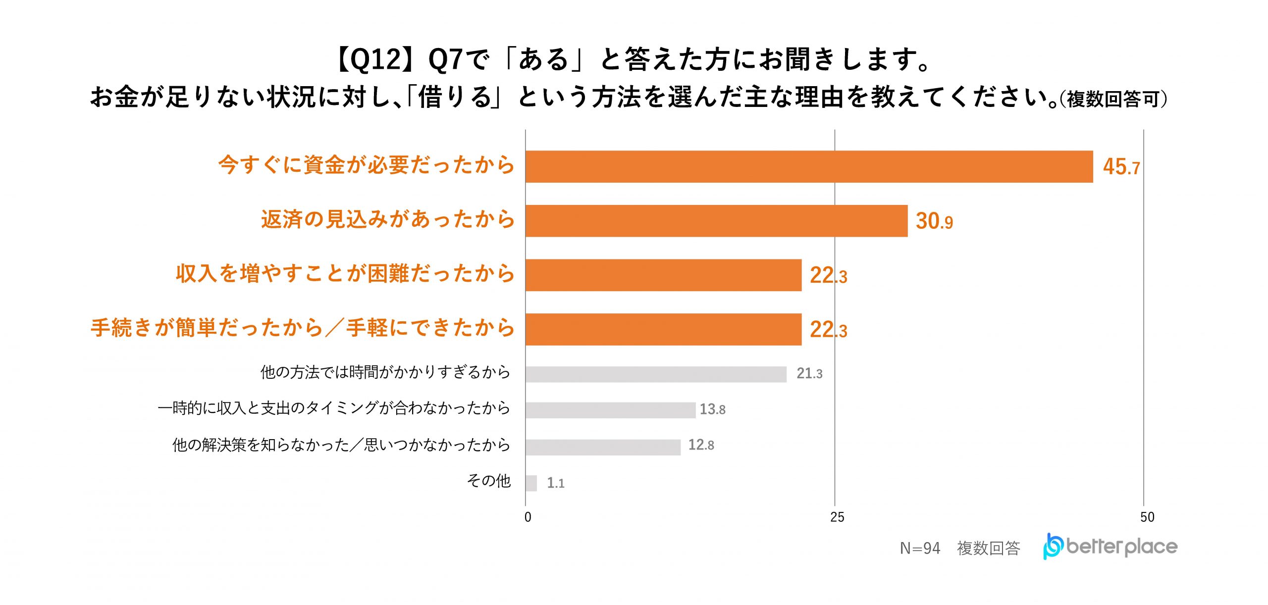 借入れがあると答えた人に、お金が足りない状況に対し「借りる」という方法を選んだ理由を聞いたところ、「今すぐに資金が必要だったから」と回答した人が45.7%と最も多く、次いで「返済の見込みがあったから」が30.9%、「収入を増やすことが困難だったから」が22.3%、「手続きが簡単だったから/手軽にできたから」が22.3%という結果となりました。