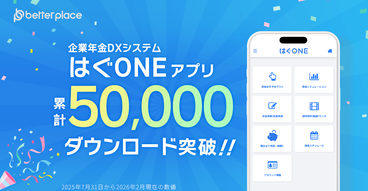 「福祉はぐくみ企業年金基金」(以下、「はぐくみ企業年金」)を中心に、企業年金・退職金制度の導入・設計をサポートする株式会社ベター・プレイス(本社:東京都新宿区、代表取締役社長:森本 新士、https://bpcom.jp/ 、以下、ベター・プレイス)は、2025年7月31日にリリースした「はぐくみ企業年金」の導入法人・加入者に向けた企業年金DXシステム「はぐONE」のスマートフォンアプリが、約半年で累計5万ダウンロードを突破したことをお知らせします。