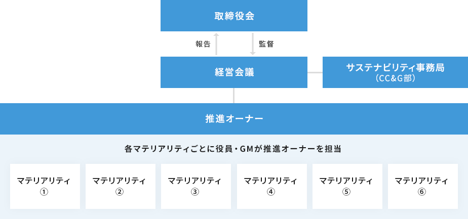 当社はコーポレートコミュニケーション&ガバナンス部が事務局としてサステナビリティを推進し、担当役員は取締役 CFO が務めています。サステナビリティ事務局はマテリアリティごとの進捗状況のモニタリングを四半期ごとに行い、経営会議で報告・議論し、取締役会へ付議・報告します。